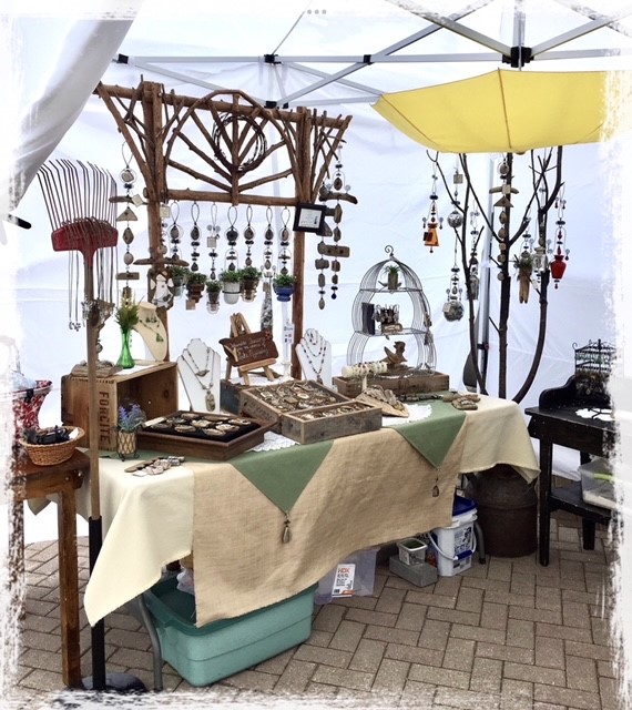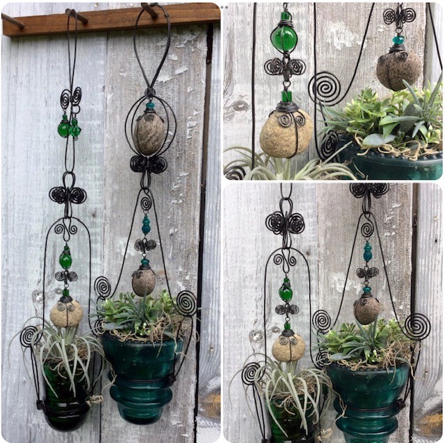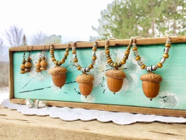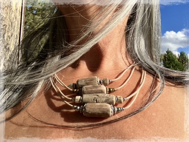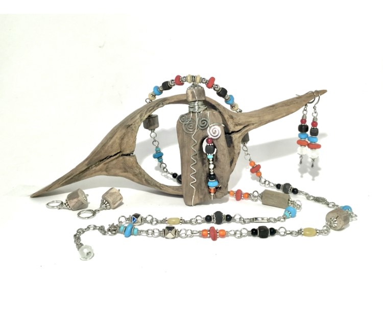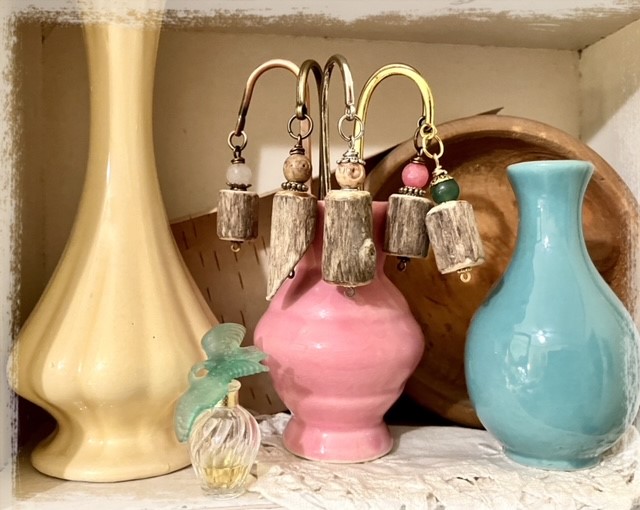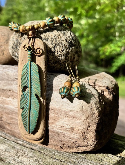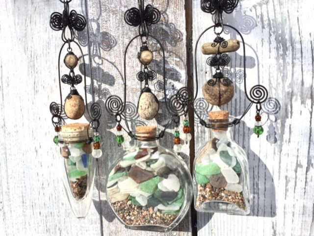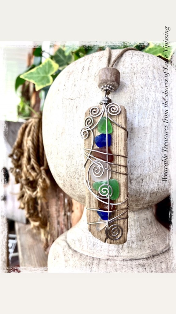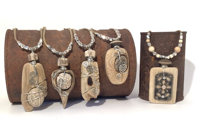 Aline collects treasures from the shores of Lake Nipissing (driftwood, stones, beach glass, shards of porcelain, bricks, etc.) These are intricately worked and transformed into unique wearable and decorative art.
