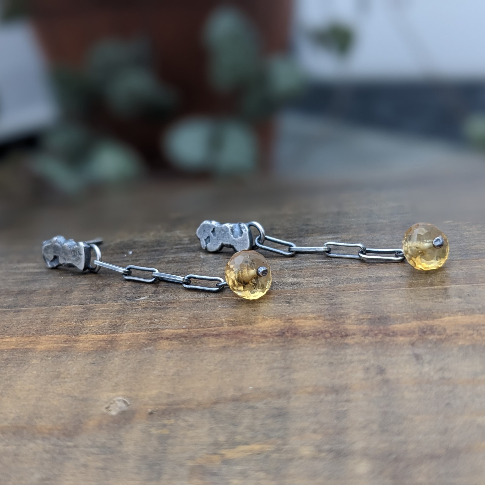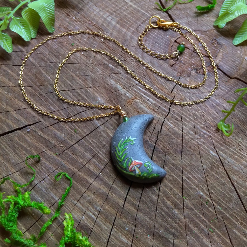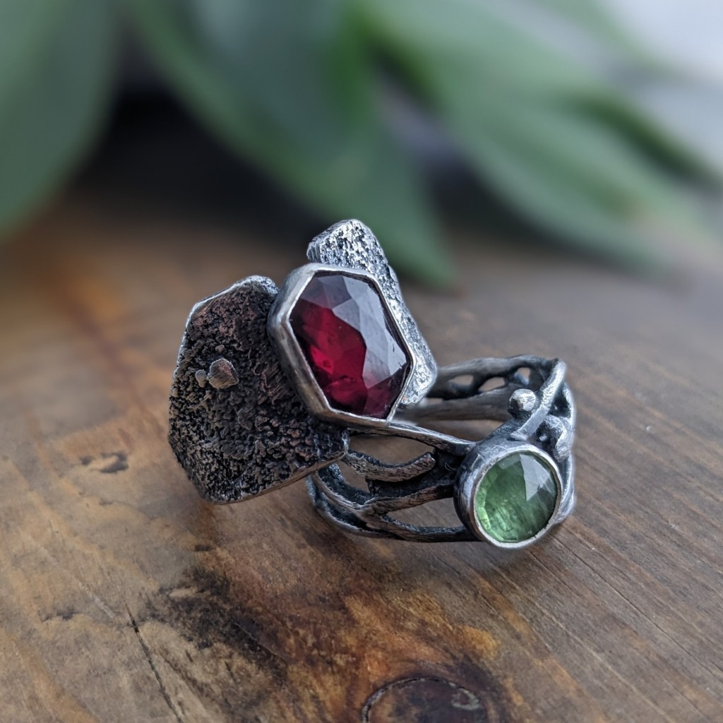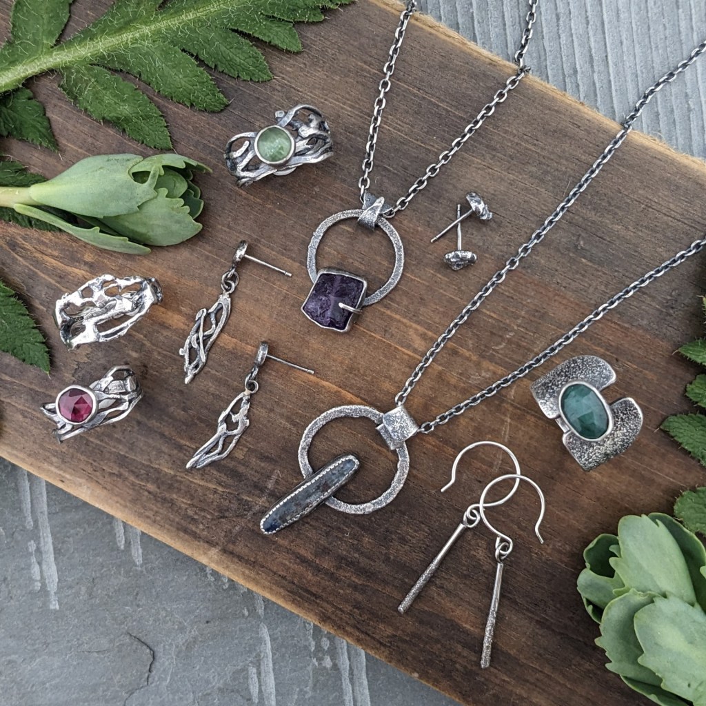 Aline collects treasures from the shores of Lake Nipissing (driftwood, stones, beach glass, shards of porcelain, bricks, etc.) These are intricately worked and transformed into unique wearable and decorative art.